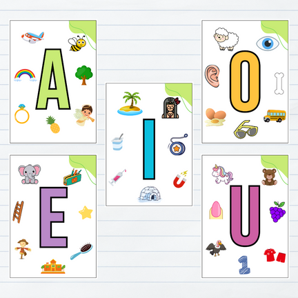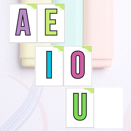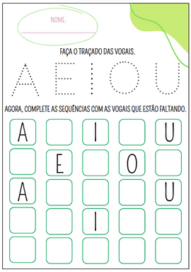 Apresentando as cinco vogais do alfabeto, este recurso é ideal para impressão em formato paisagem, dispondo de duas letras cuidadosamente distribuídas em cada folha.