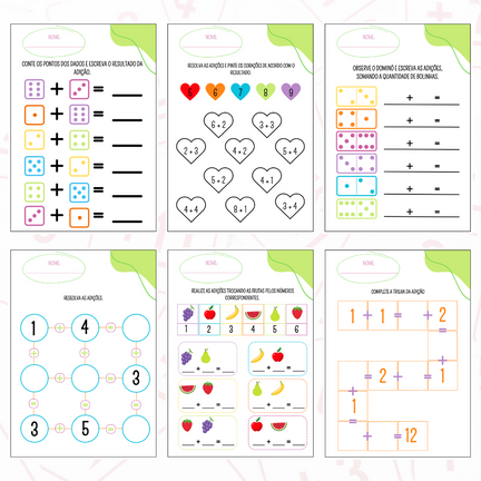 Este ebook contém atividades exclusivas de adição simples com pequenos números, direcionadas para crianças que estão iniciando o processo de aprendizagem do registro da adição.
