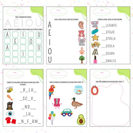 Um ebook de atividades pedagógicas com o tema "vogais".