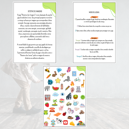 O jogo "Detetive das Imagens" tem como principal objetivo ampliar o repertório de elementos que iniciam com cada letra do alfabeto, de forma lúdica e divertida.