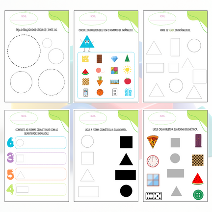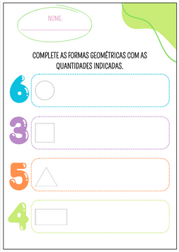 Ajude suas crianças a identificar e associar as formas geométricas através deste ebook lúdico e interativo, que conta com exercícios de contorno, contabilizar quantidades, e muito mais.
