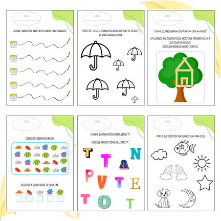 Exercícios de pintura, contorno, escrita, identificação de símbolos e desenhos variados.